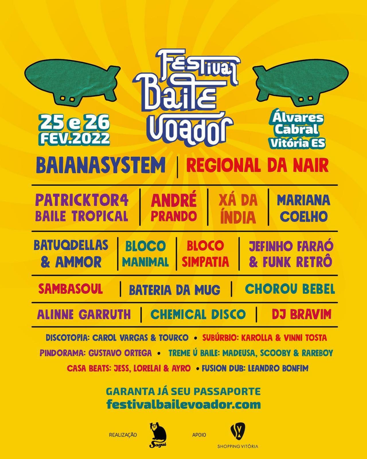 O Baile Voador cresceu, agora é Festival, e já tem line-up completo para a edição do Carnaval 2022, que acontecerá nos dias 25 e 26 de fevereiro no Álvares Cabral, em Vitória. Serão 2 dias de festa e mais de 20 atrações espalhadas em dois palcos: Tropical e Surreal. No line-up, uma profusão de ritmos, a começar pelo headliner BaianaSystem.