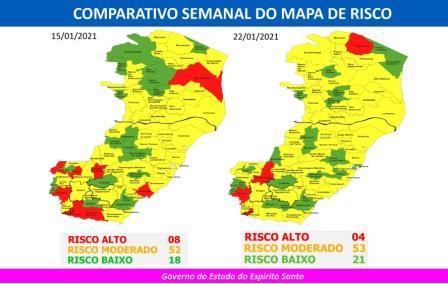A vigência do 41º Mapa, tem vigência entre a próxima segunda-feira (25) e o domingo (31). Dos 78 municípios capixabas, 21 estão classificados em Risco Baixo e 53 estão em Risco Moderado. Somente quatro municípios (Bom Jesus do Norte, Guaçuí, Montanha e Muniz Freire) estão classificados como Risco Alto.