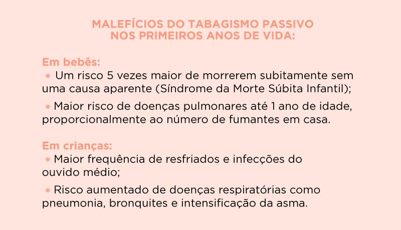 Segundo o Ministério da Saúde, bebês e crianças são ainda mais suscetíveis ao tabagismo passivo, isso porque o fumante pode ser um dos pais ou responsáveis, e por elas serem impotentes diante da situação. Além disso, conforme o artigo da Sociedade Brasileira de Pediatria, o desenvolvimento incompleto do aparelho respiratório e a relação entre o volume de substâncias tóxicas inaladas e o peso da criança tornam a exposição ao cigarro ainda mais maléfica durante a infância.