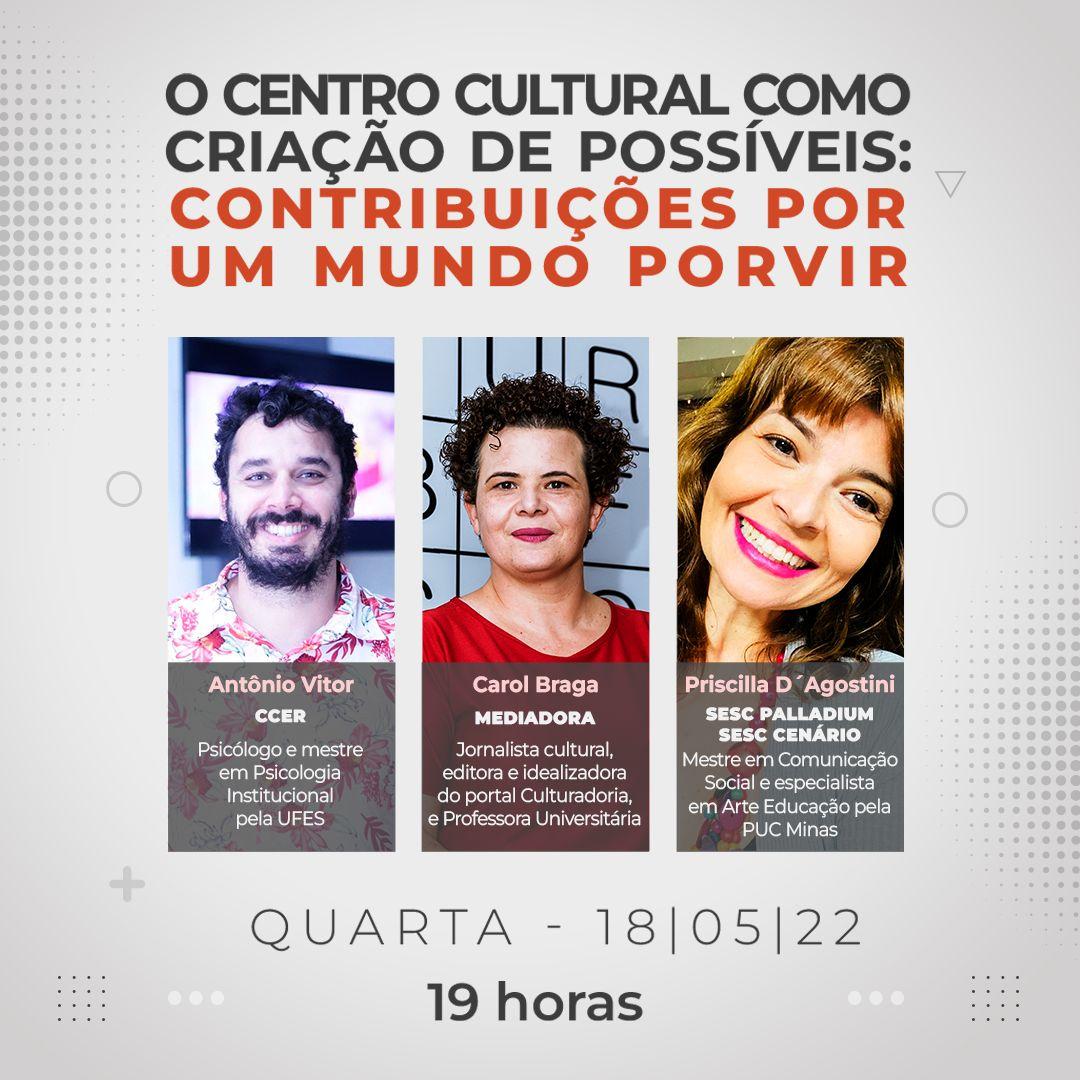 O evento contará com a mediação de Carol Braga, jornalista cultural, editora e idealizadora do portal Culturadoria, consultora em comunicação digital e professora universitária e os convidados são Antônio Vítor, psicólogo e diretor do Eliziário Rangel e Priscilla D’Agostini, presidente do Sesc Palladium, localizado em Belo Horizonte.