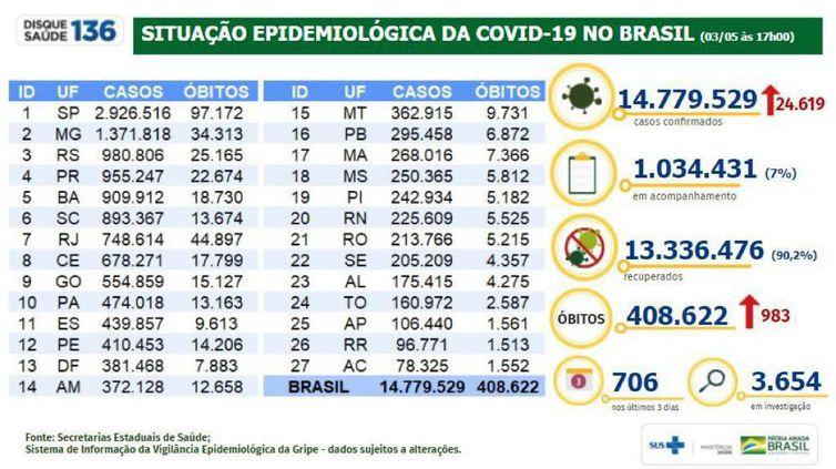 Já o total de pessoas infectadas desde o início da pandemia subiu para 14.779.529. De ontem para hoje, as secretarias de Saúde acrescentaram às estatísticas 24.619 diagnósticos positivos. Ontem, o total de casos confirmados pelas autoridades de saúde era 14.754.910.