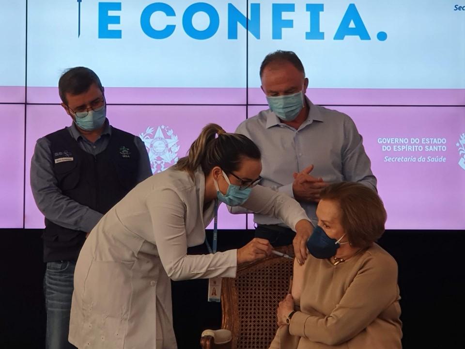 Marcada por muita felicidade e sentimento de gratidão, o ato simbólico de início de vacinação da população idosa de 90 anos ou mais contou com a presença de seis cidadãos desta faixa etária para representar a população capixaba. A primeira a receber a imunização foi a cerimonialista do Palácio Anchieta, Hilda Cabas, 92 anos de idade, que há 40 anos dedica-se ao trabalho como servidora pública do Executivo.