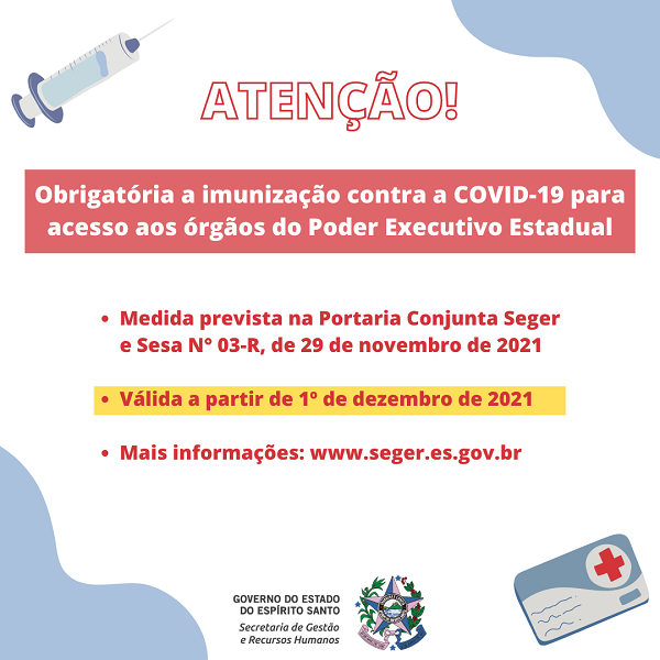 A partir de quarta-feira (1º), o acesso às dependências físicas dos órgãos e entidades do Poder Executivo Estadual será delimitado aos agentes públicos que estiverem devidamente imunizados contra a Covid-19. É o que estabelece a Portaria Conjunta SEGER/SESA Nº 03-R, publicada no Diário Oficial do Estado desta segunda-feira (29).