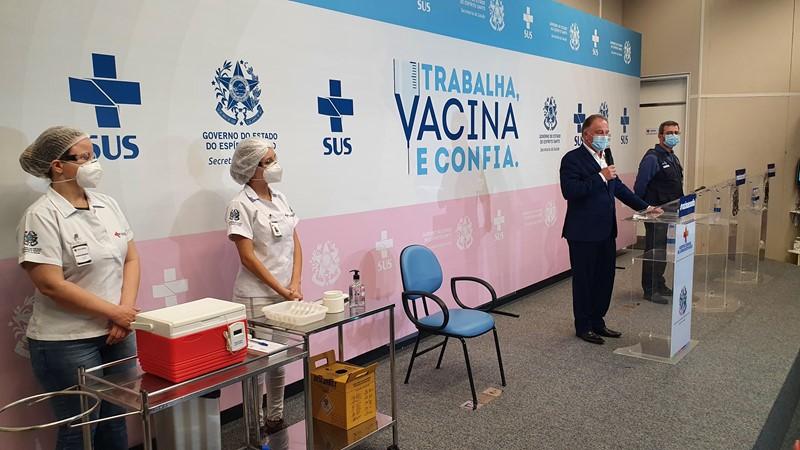 A solenidade de início da vacinação realizada nesta segunda (18), em que os primeiros profissionais de saúde foram vacinados, contou também com a presença do governador Renato Casagrande e do secretário de Estado da Saúde, Nésio Fernandes, além de outras autoridades.