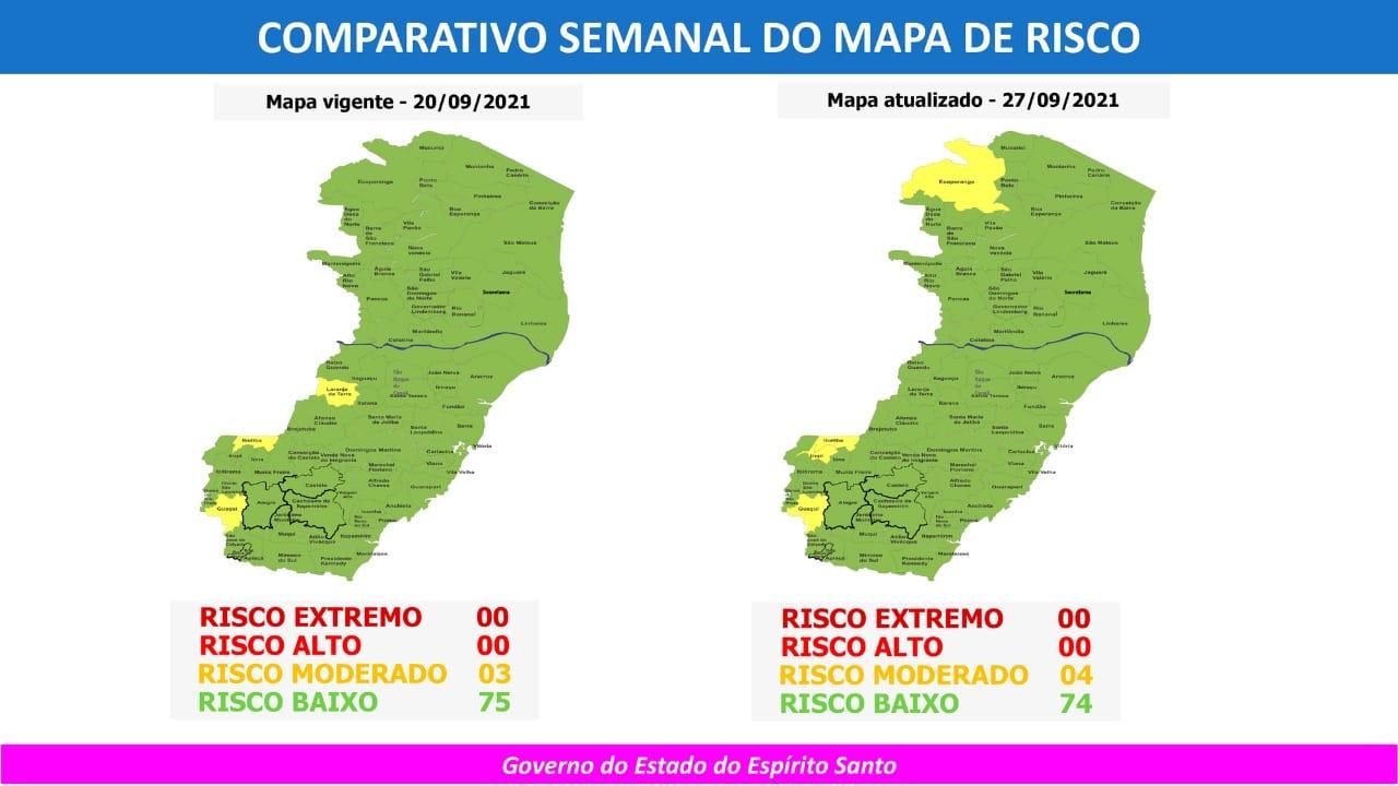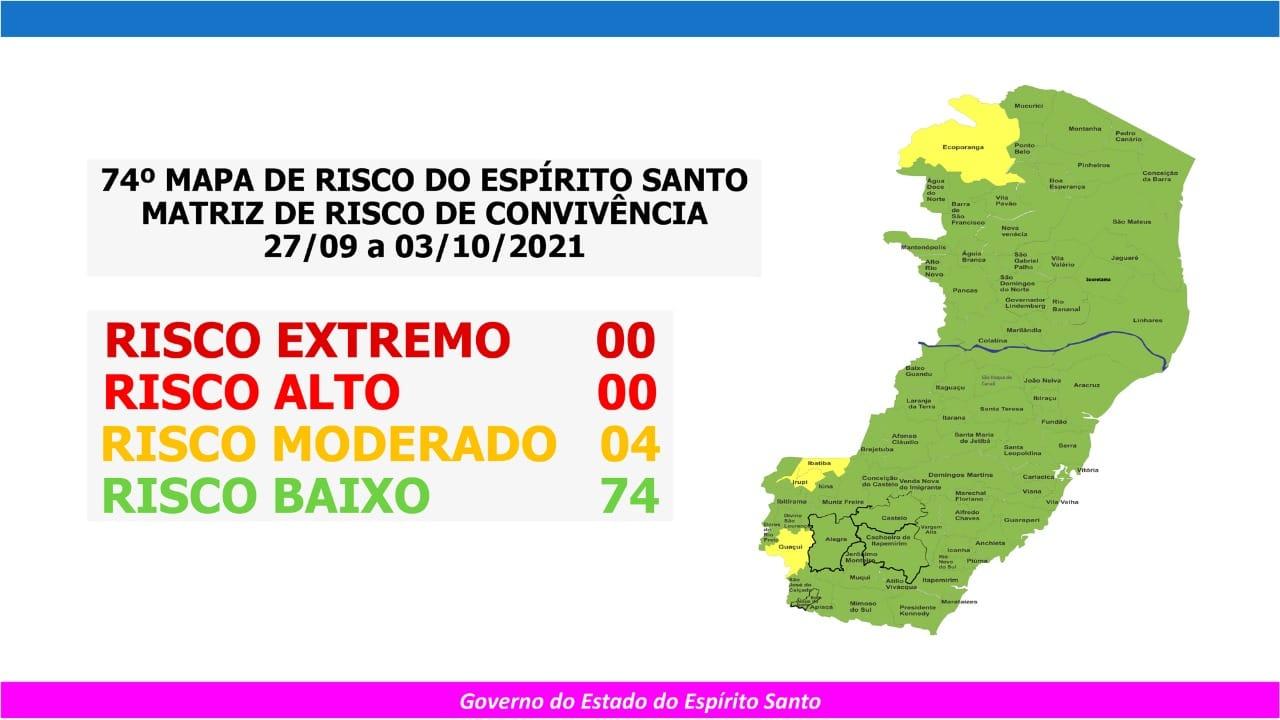 O Governo do Espírito Santo anunciou, nesta sexta-feira (24), o 74º Mapa de Risco Covid-19, que terá vigência desta segunda-feira (27) até o próximo domingo (03).