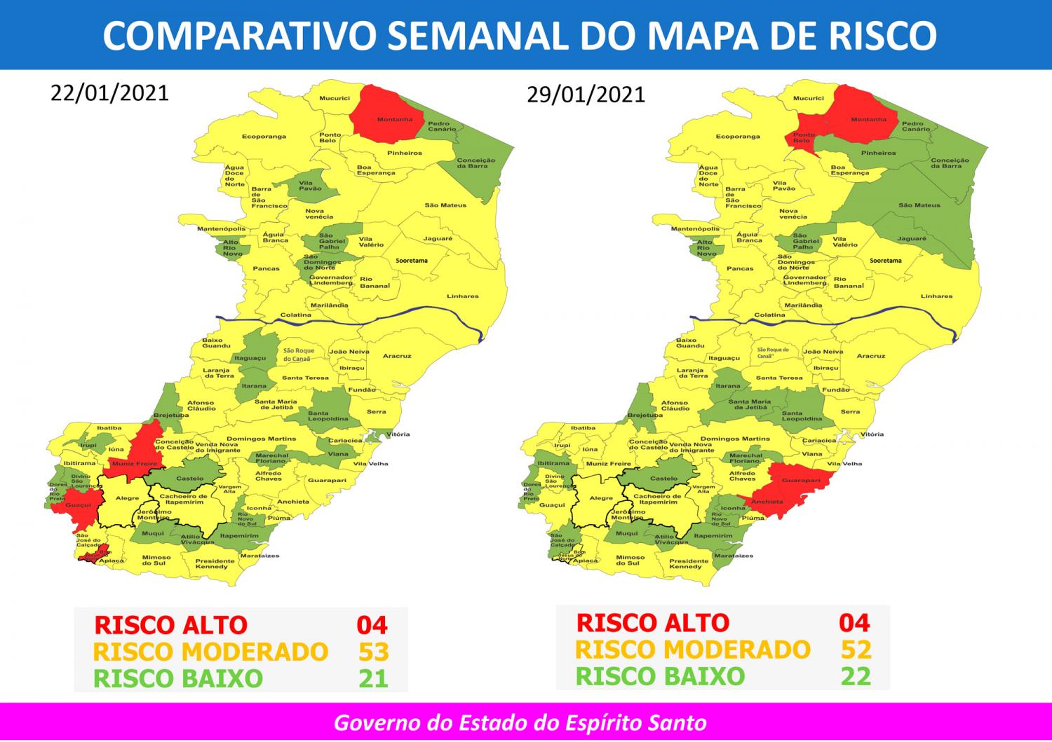 O Governo do Estado anunciou, nesta sexta-feira (29), o 42º Mapa de Risco Covid-19, que terá vigência entre a próxima segunda-feira (1º) e o domingo (07). Dos 78 municípios capixabas, 22 estão classificados em Risco Baixo e 52 estão em Risco Moderado. Somente quatro municípios (Anchieta, Guarapari, Montanha e Ponto Belo) estão classificados como Risco Alto.