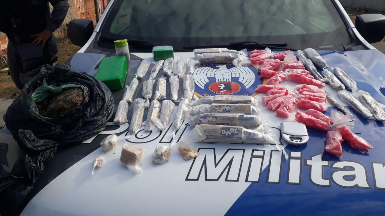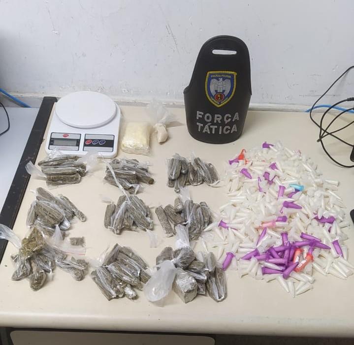 Já em Barro Branco, militares da Força Tática localizaram e apreenderam 560 pinos de cocaína, 89 buchas de maconha, 2 papelotes de cocaína e duas balanças de precisão.