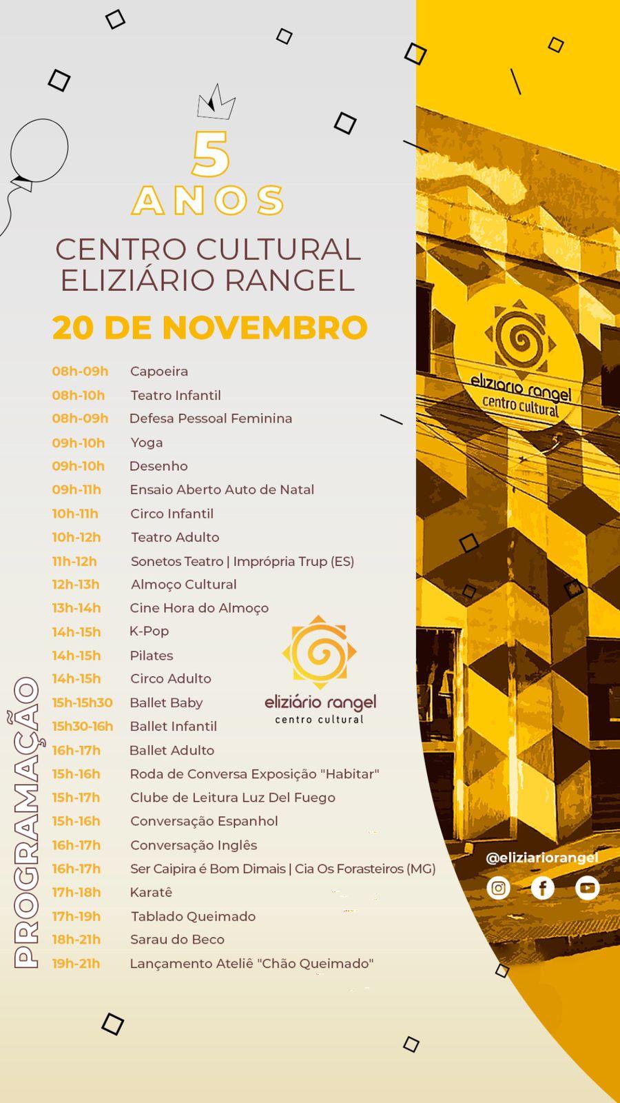 Neste sábado (20), o Centro Cultural Eliziário Rangel, localizado em São Diogo, na Serra, abre suas portas com uma programação especial, que acontecerá entre 8h e 21 horas, para comemorar os seus 5 anos de atividades. O espaço é referência na produção de iniciativas culturais para todas as idades.